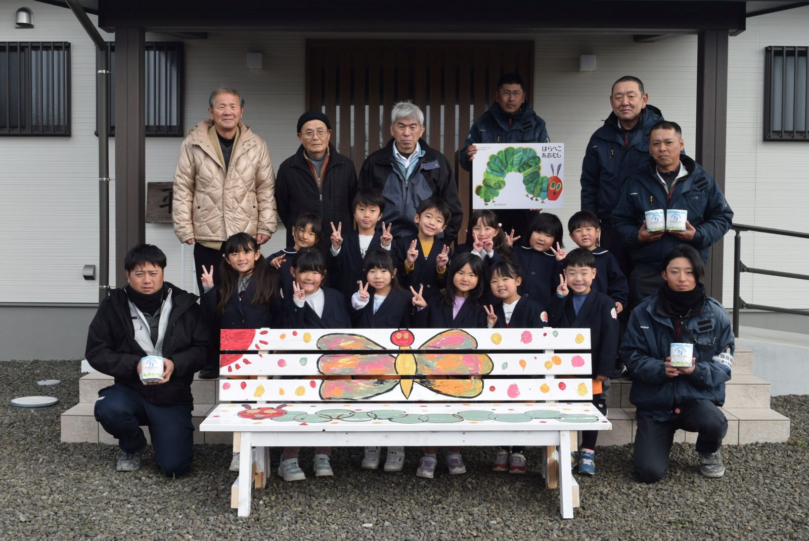 工事完了を前に、工事を通して関わらせていただいた地域の皆様へ、理解と協力の感謝の気持ちを込めて企画いたしました。ベンチの色塗りは、地元の園児たちに協力していただいております。