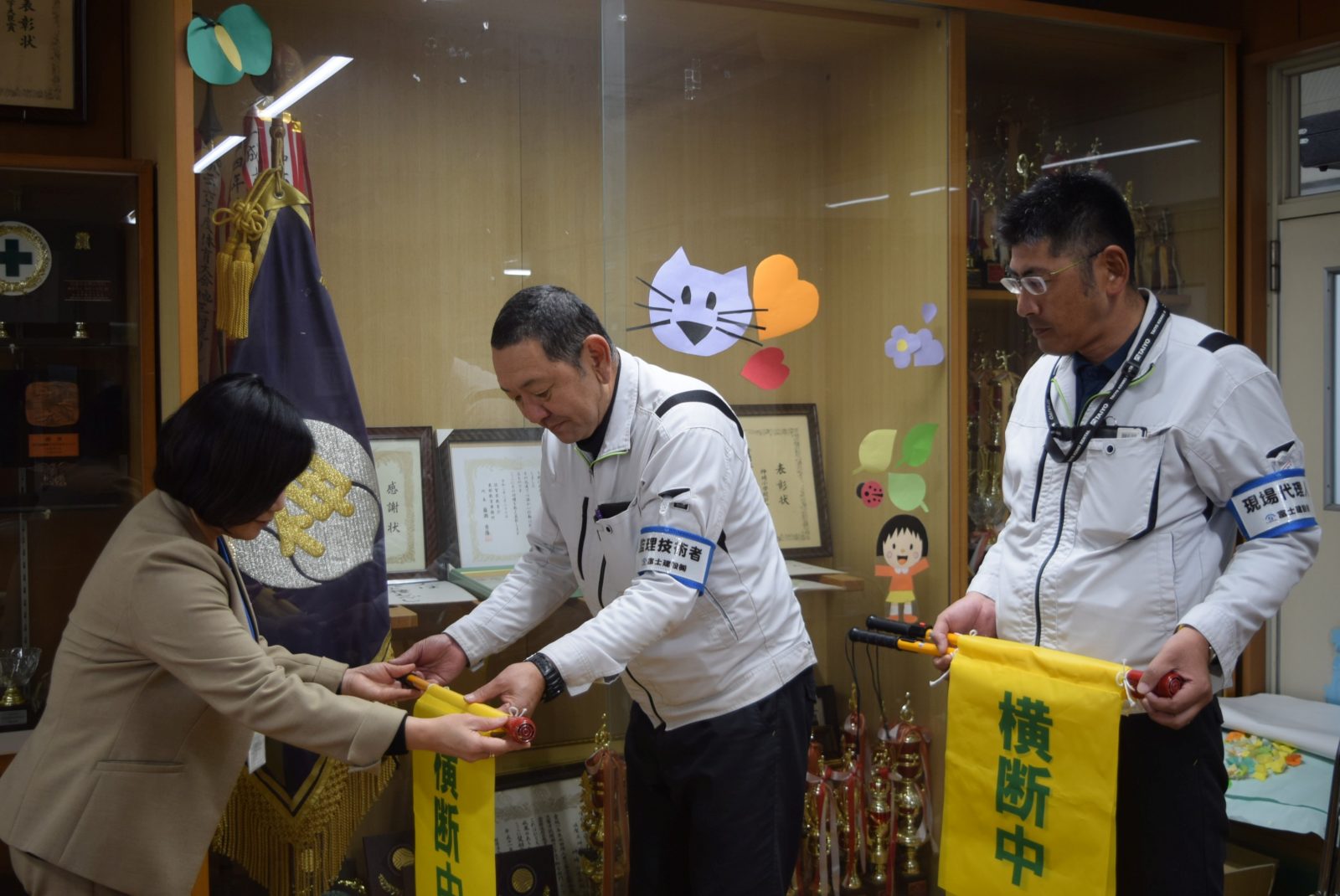 令和8年1月26日に、神崎市立神崎小学校へ横断旗を寄贈いたしました。 寄贈した横断旗は警笛付きで、手元のボタンを押すと音が鳴る仕組みとなっており、周囲への注意喚起を促すことができます。 工事に伴い地域の道路を使用する中、子どもたちの登下校を見守る地域の人たちの姿を目にしたことが、寄贈のきっかけとなりました。横断旗は、通学時の安全活動に役立てていただく予定です。 今後も地域の皆様へ安全と安心につながる取り組みを大切にしてまいります。